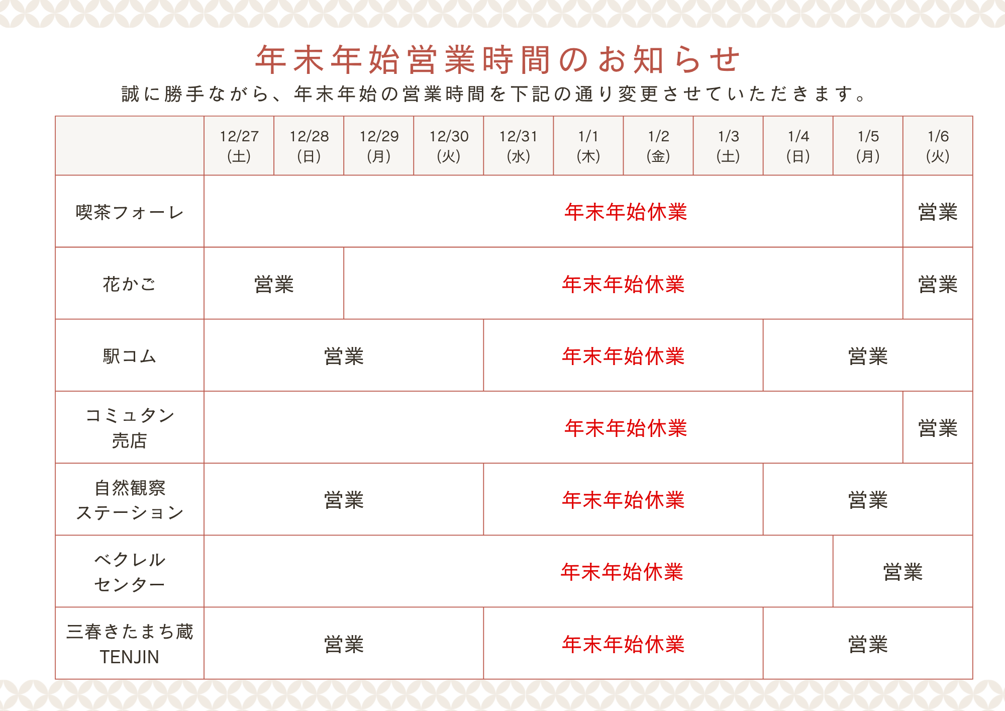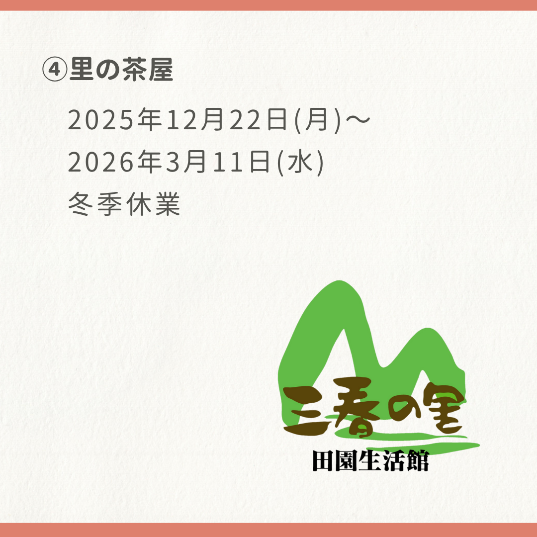 年末年始の営業日、営業時間のお知らせです。 . 年内休まず営業いたします。 . 里の茶屋は12月22日(月)より冬季休業に入ります。 🌸三春の里 田園生活館🌸 【所在地】〒963-7722 福島県田村郡三春町大字西方字石…