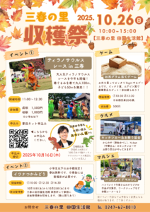 三春の里 田園生活館では、“三春の里収穫祭”を開催します。 開催日時 2025年10月26日(日)10:00~15:00 ティラノサウルスレースin三春 大好評のティラノサウルスレースを今年も開催! 着ぐるみを着て大人1…