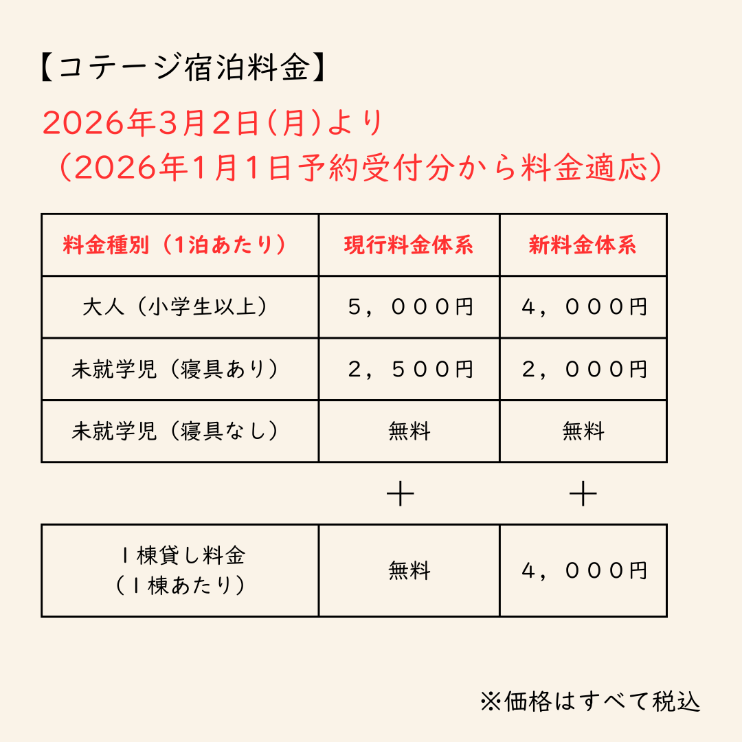 この度、令和8年3月2日(令和8年1月1日以降予約受付分)より、宿泊料金の体系を下記の通り変更させていただくことになりました。