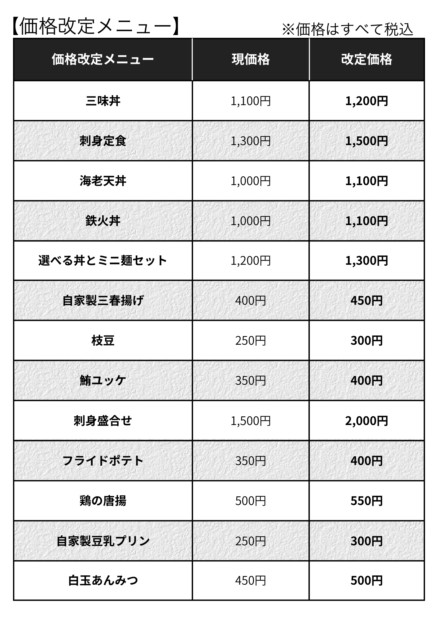 いつもお食事処「四季菜」をご利用いただき、誠にありがとうございます。 この度、原材料の高騰に伴い、一部価格改定をさせていただきます。 お客様にはご負担をおかけすることになりますが、引き続きご満足いただける品質とサービスの…