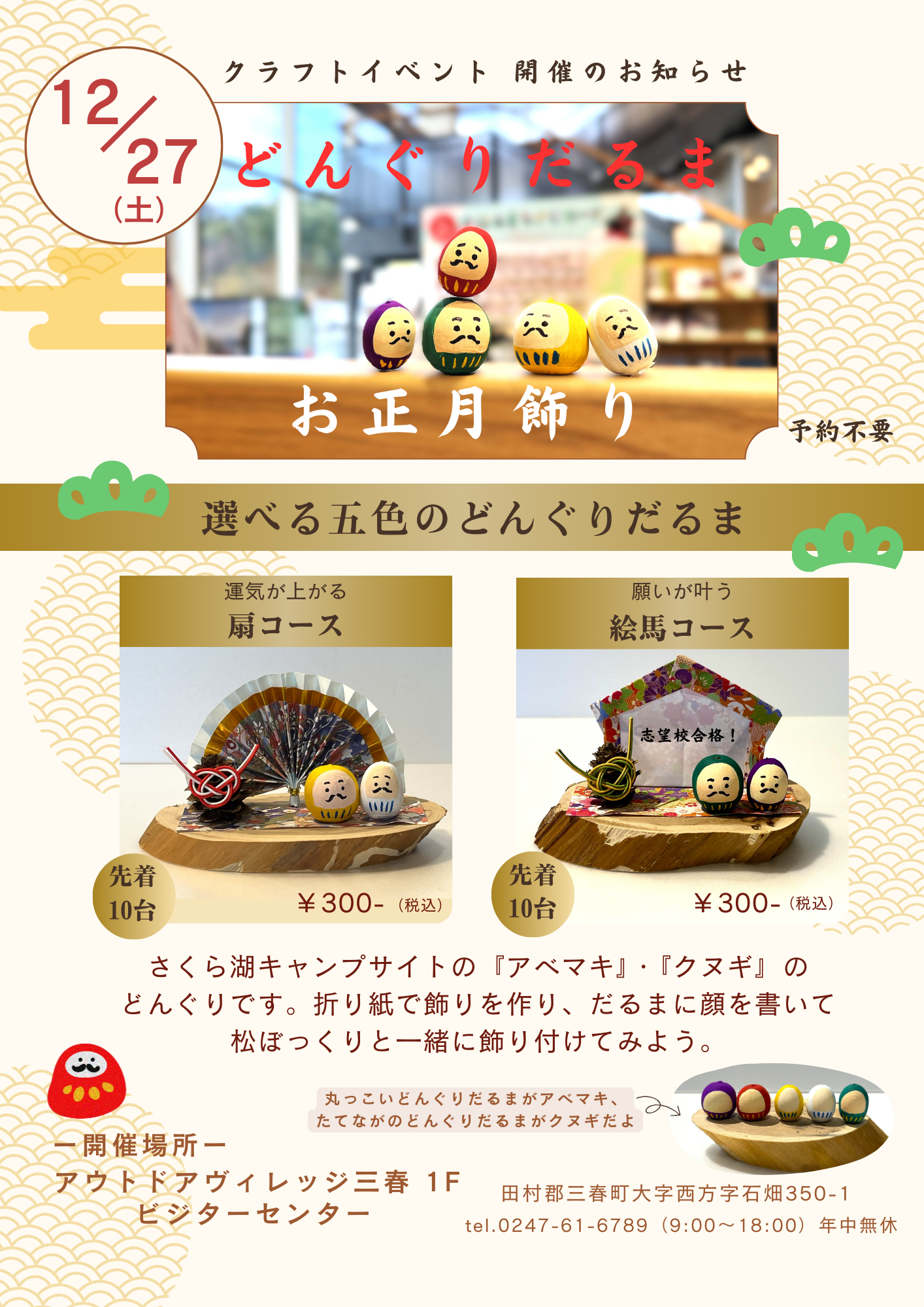 どんぐりだるま正月飾り さくら湖キャンプサイトの『アベマキ』『クヌギ』のどんぐりを使います。 折り紙で飾りを作り、だるまに顔を描いて、松ぼっくりと一緒に飾り付けてみよう。 ▼日 時 2025年12月27日(土) 9:…